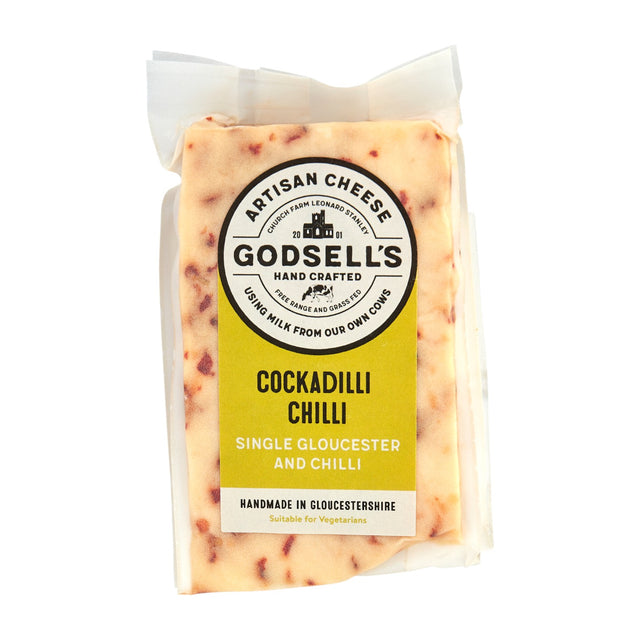 Godsells Cockadilly Chilli is a mouth-watering cheese that brings a fiery kick to any cheeseboard. Made with Three Virgins cheeses and select chilli's, this cheese is perfect for those who love the heat of Mediterranean tomatoes. Named after a small hamlet near Nympsfield, this locally made cheese is a must-try for spice lovers.