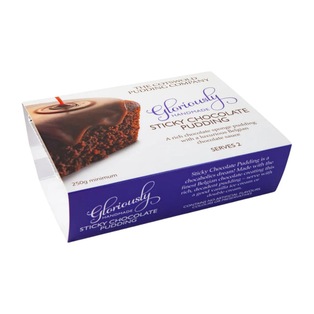 Delight your taste buds with Cotswold Pudding Co.'s Sticky Chocolate pudding. Made with a rich chocolate sponge and topped with a luxurious Belgian chocolate sauce, this indulgent dessert is sure to satisfy your sweet tooth. Enjoy a decadent treat and elevate your dessert game with our Sticky Chocolate pudding.